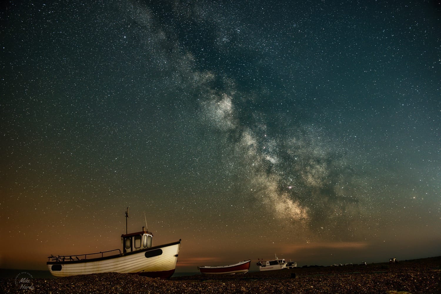 The ancient fishing vessel, the 'Moonraker', stands still proud on the shingle beneath a Milky Way sky.